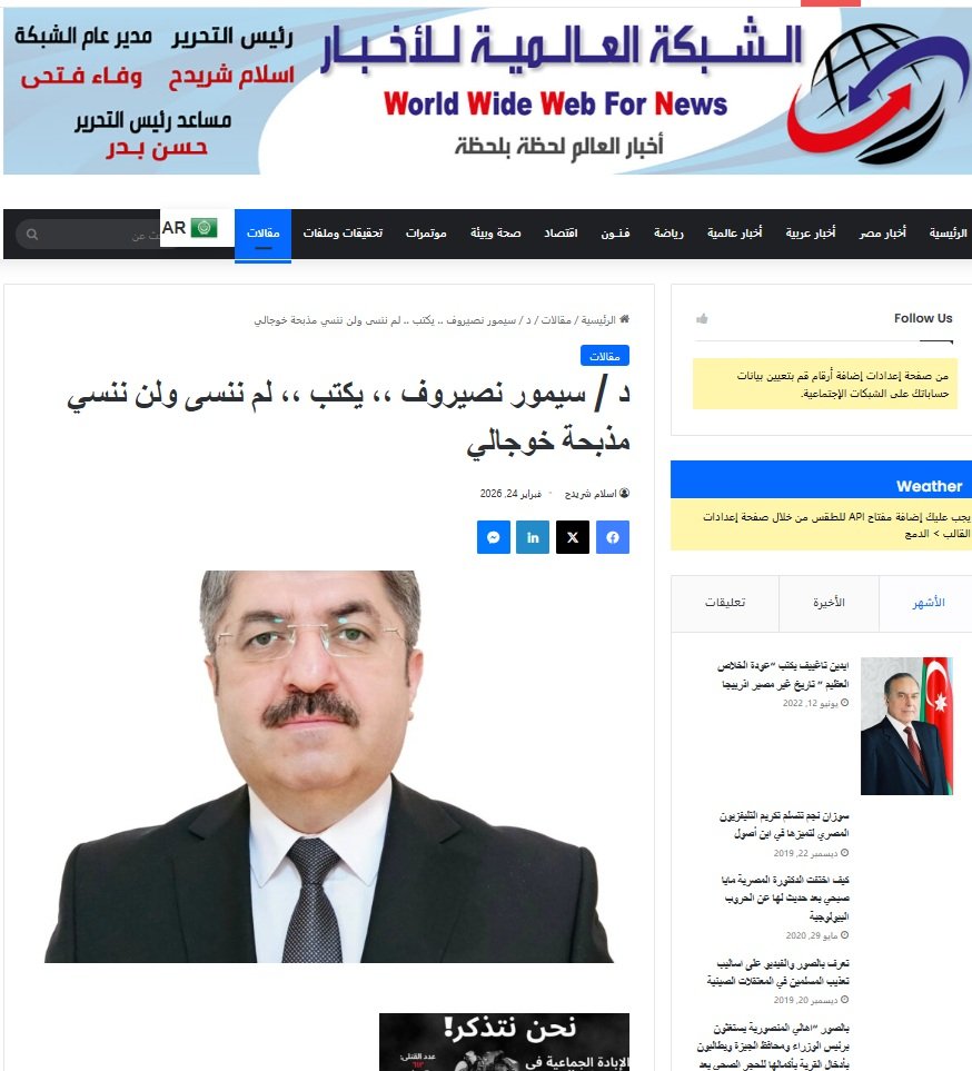 Misir, Əlcəzair, İraq, Süriya və.s ərəb ölkələri mediasında Azərbaycan-Misir Dostluq Cəmiyyətinin İdarə Heyətinin sədri, tədqiqatçı-alim Seymur Nəsirovun Xocalı soyqırımının 34-cü ildönümü ilə bağlı məqaləsi dərc olunub. Məqalədə Xocalı faciəsinin səbəbləri və tarixi barədə məlumat verilib.
