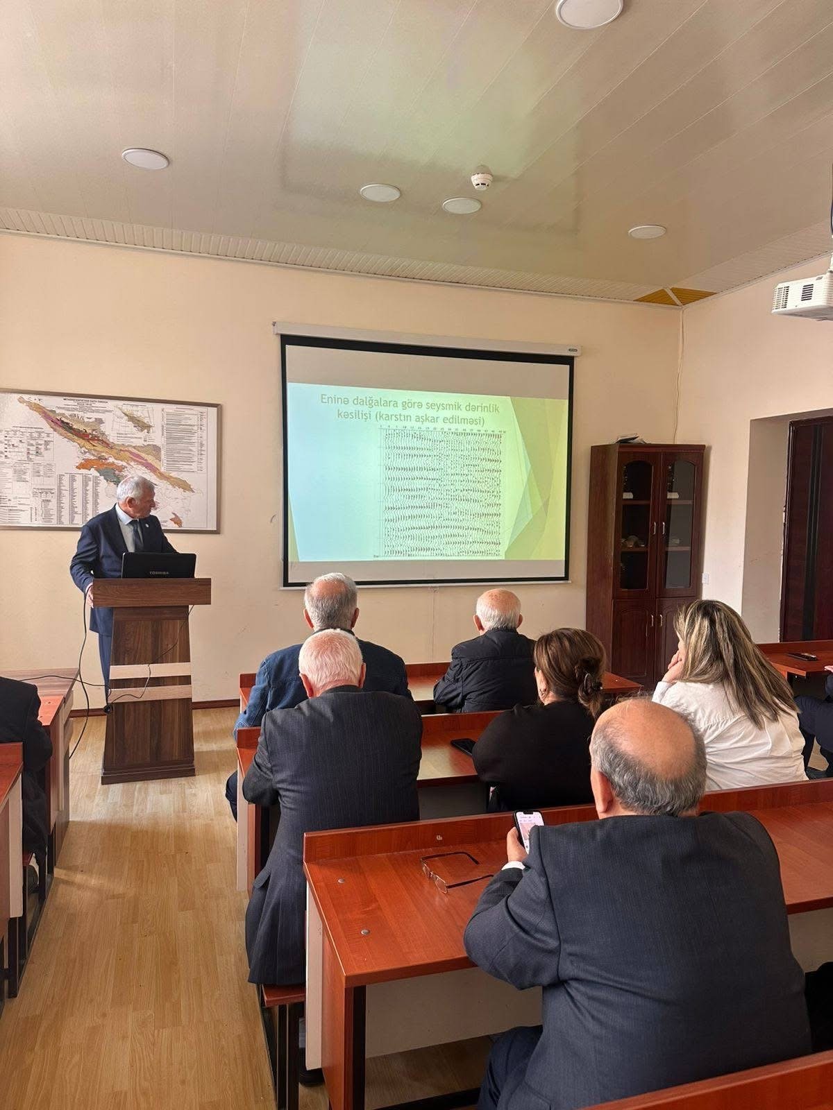 Seminarın əsas məruzəçisi, BDU Geologiya fakültəsinin Seysmologiya və Yer təkinin fizikası kafedrasının dosenti Əli Novruzov “Şəhərsalmada kiçik sürətlər zonasının öyrənilməsinin aktuallığı” mövzusunda geniş və əhatəli təqdimatla çıxış etmişdir. Məruzədə yer təkinin quruluşu, seysmik dalğaların yayılma xüsusiyyətləri və bu dalğaların sürətində müşahidə olunan dəyişikliklərin mühəndis-geoloji baxımdan interpretasiyası izah edilmişdir.