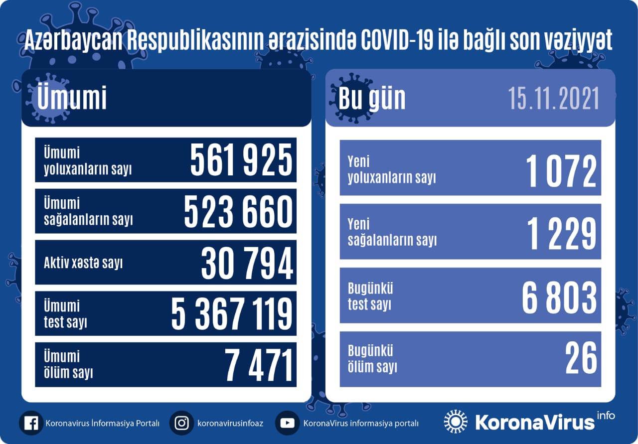 Nazirlər Kabineti yanında Operativ Qərargahdan verilən məlumata görə, analiz nümunələri müsbət çıxan 26 nəfər vəfat edib.