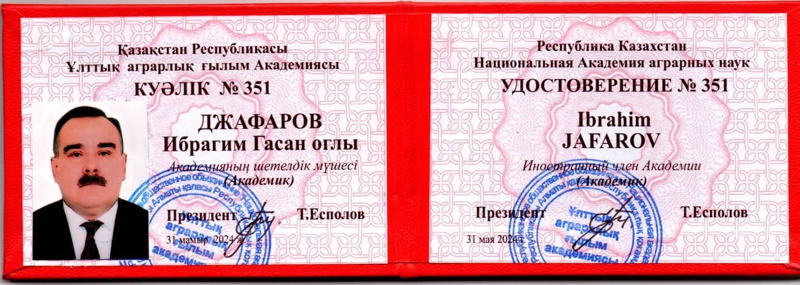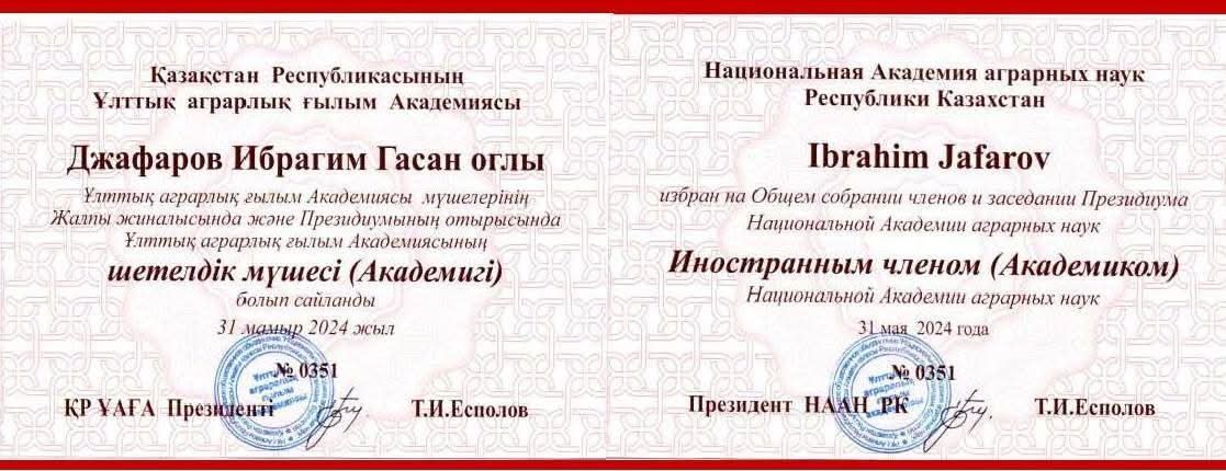 Bitki Mühafizəsi və Texniki Bitkilər Elmi-Tədqiqat İnstitutunun direktoru, professor İbrahim Cəfərov Qazaxıstan Respublikası Milli Aqrar Elmlər Akademiyasının Xarici Üzvü fəxri adına layiq görülüb.