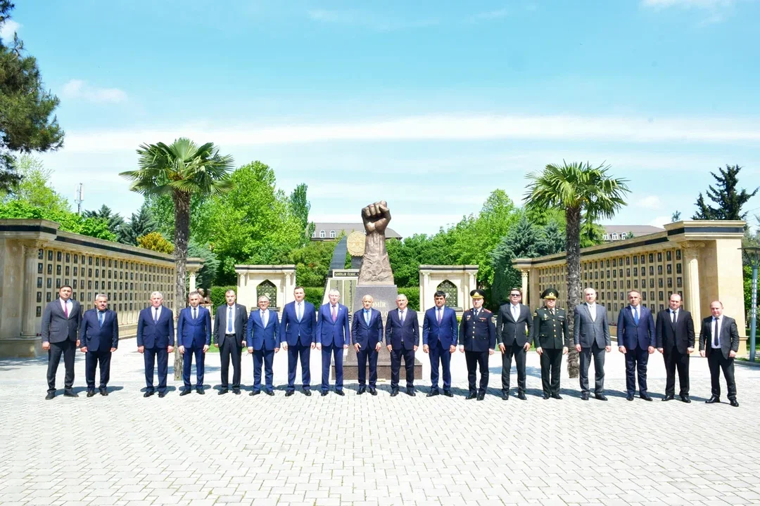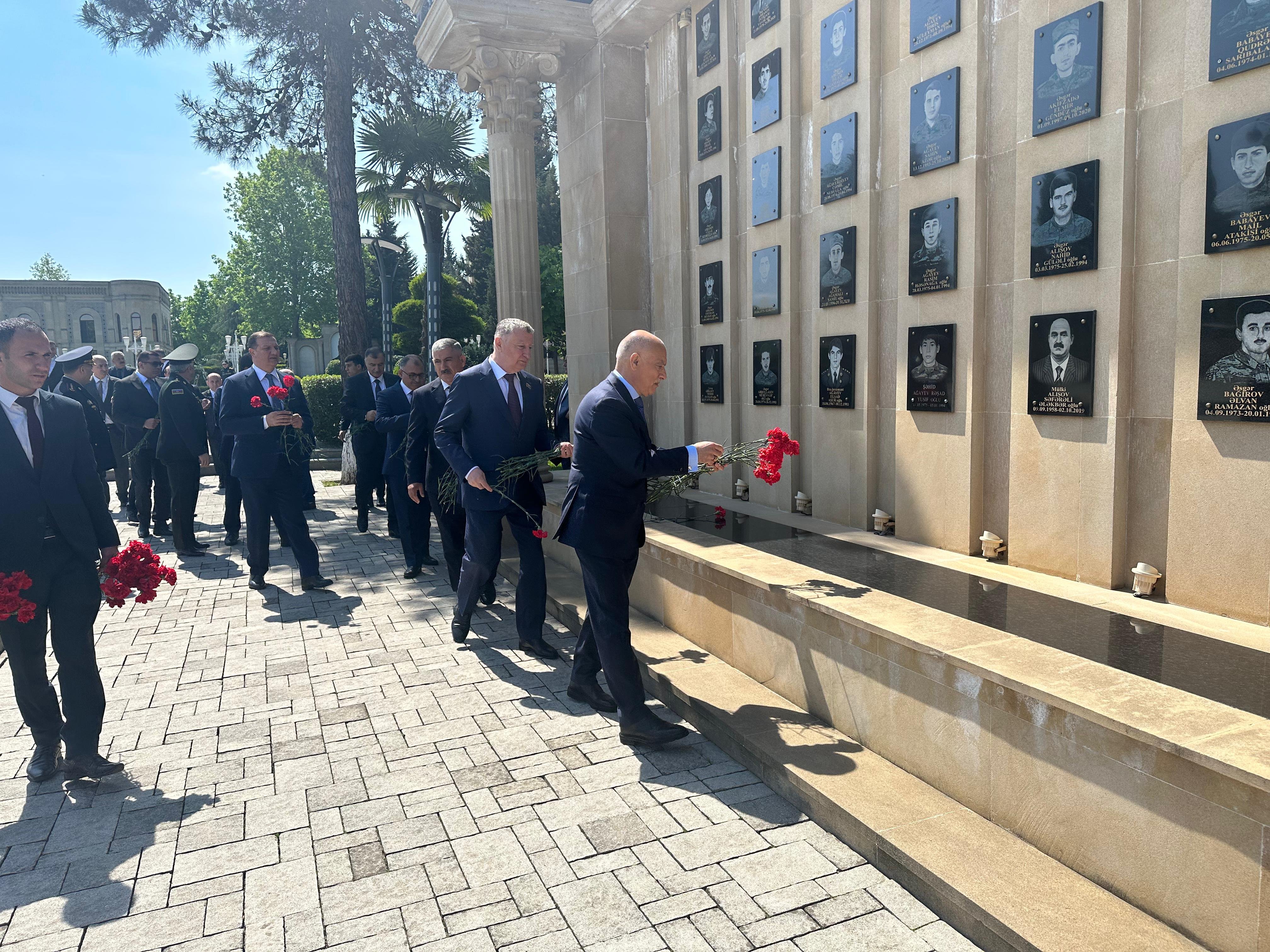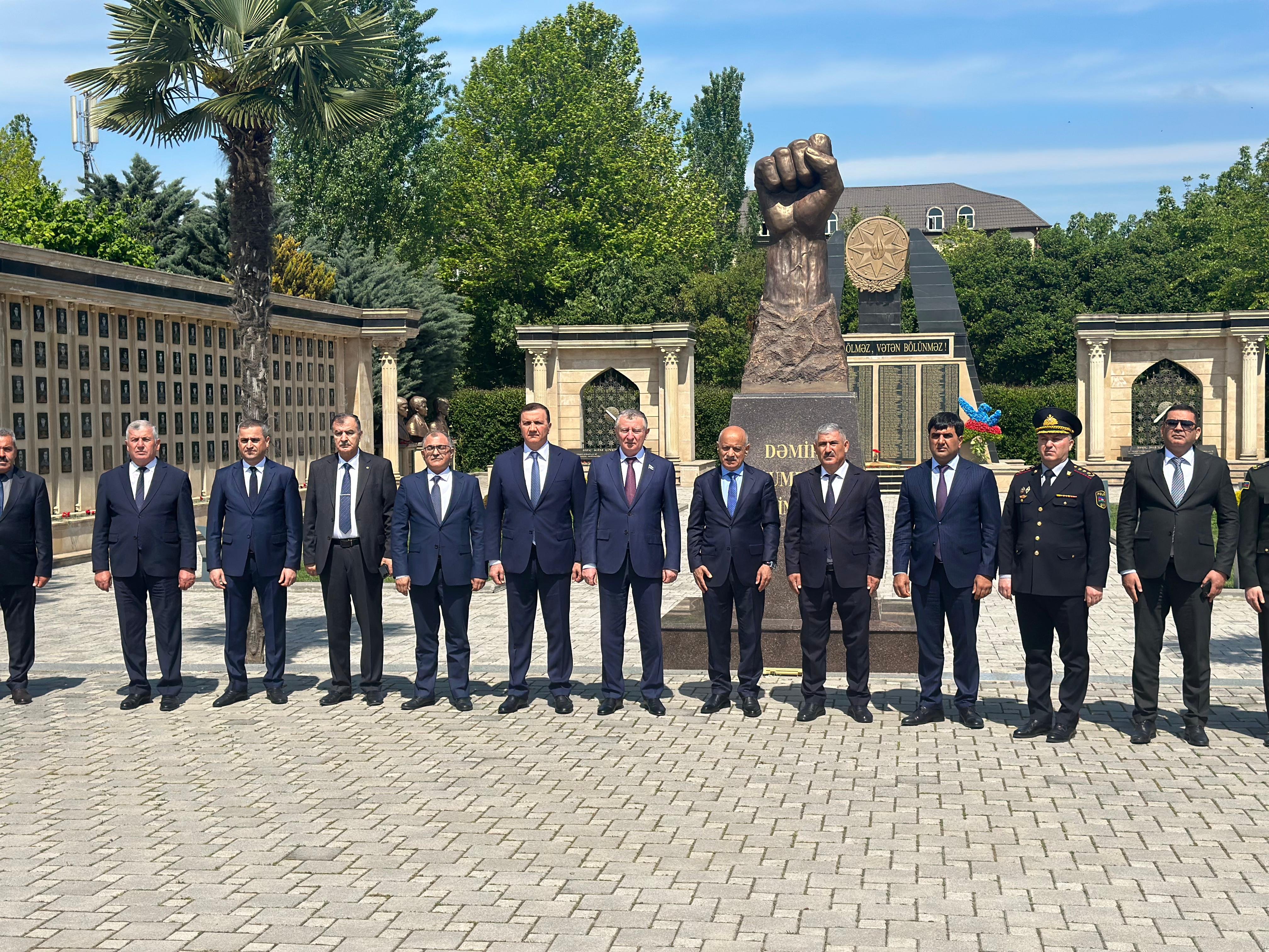 Daha sonra Masallı şəhidlərinin xatirəsinə ucaldılmış Qəhrəmanlar Parkı və “Dəmir Yumruq” abidəsi ziyarət olunub, Vətən uğrunda canından keçən qəhrəmanlarımızın ruhuna hörmət əlaməti olaraq güllər qoyulub.